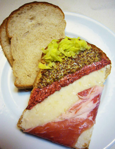 スライスした全粒粉の食パンに、ゆでてペースト状にした白花豆を塗ります。その上に茹でキャベツ、カシスマスタード、粒マスタード、生ハムをトッピング。