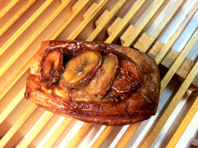 デニッシュ生地にチョコレートクリームをのせ、キャラメリゼしたバナナをトッピング。